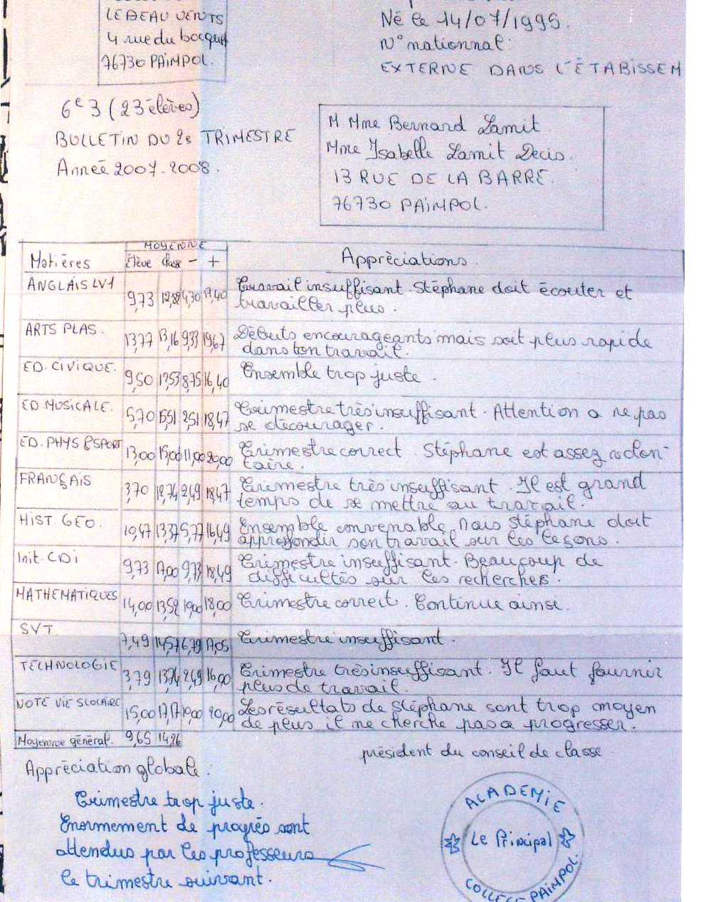 – Cela signifie que ton professeur te prend pour un imbécile qui ne sait même pas lire. Est-ce que tu te rends compte de l’image que tu donnes? Même pas lire! A ton âge!