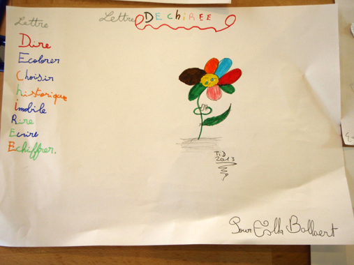 … à mes jeunes lecteurs pour tous ces magnifiques  dessins, mises en voix, en espace et même en boîtes…  que La lettre déchirée a eu le bonheur de leur inspirer ! Et merci à leurs professeurs et documentalistes qui ont organisé toutes ces très belles rencontres.